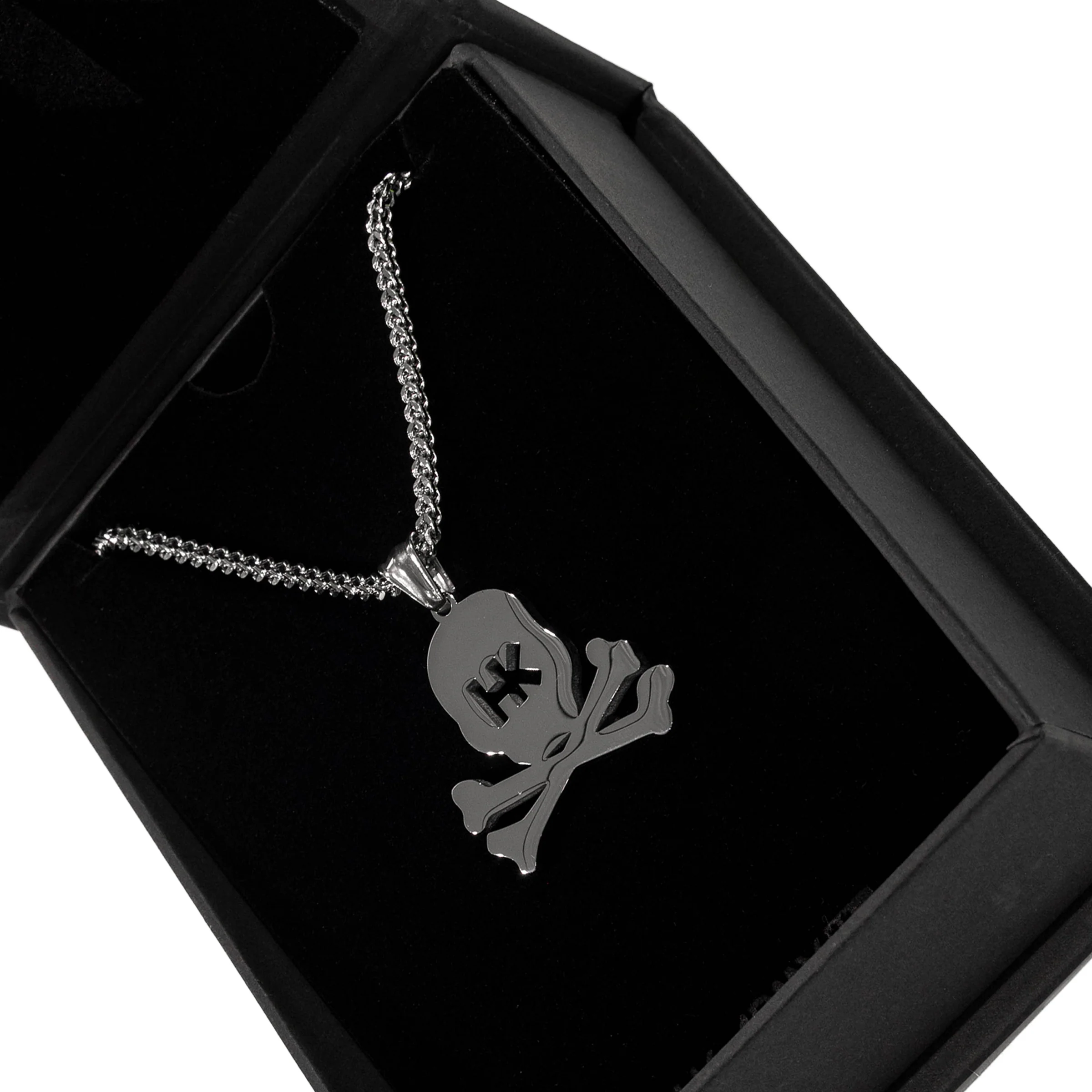 Our premium Polished Silver on High-Grade Stainless Steel Franco chain is designed for the modern person who appreciates the finer things in life. Meticulously crafted to perfection, this 3mm Franco chain showcases distinct V-shaped weave pattern, while the HK Skull pendant adds an extra level of boldness to the chain.